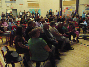 The audience listens to the presentation intently.
