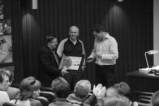 Stephen Bruneau present Garry Cranford of Flanker Press with